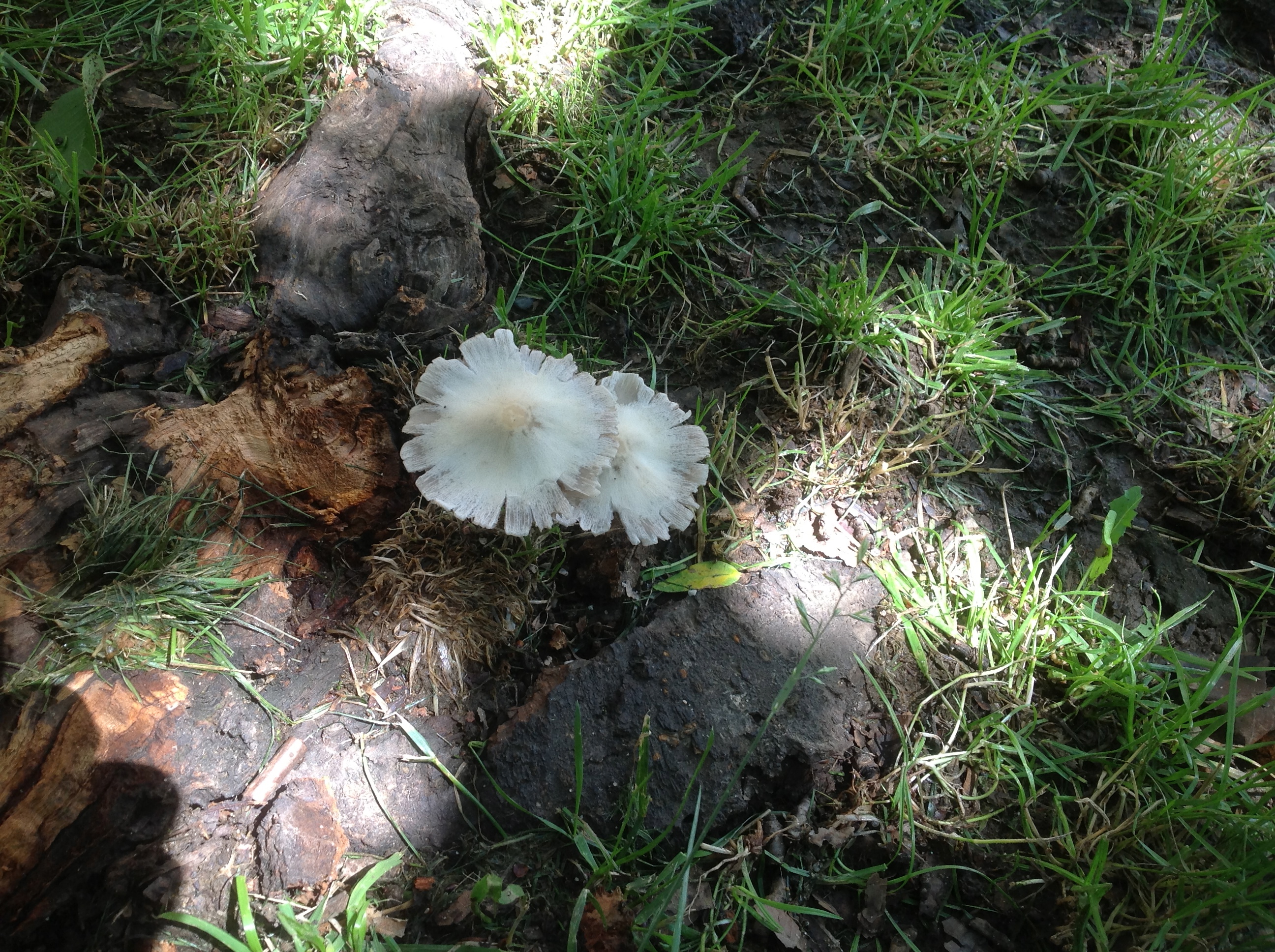 This white mushroom was growing outside the school building, by a bench that had been built around a tree trunk.