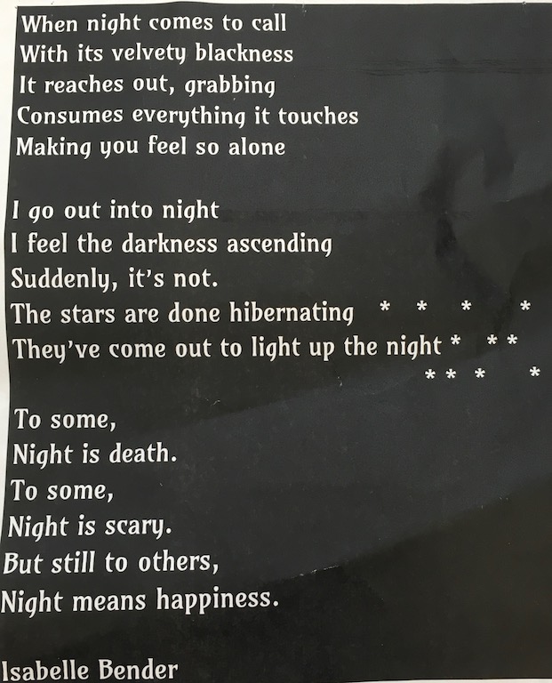 Dear darling daughter Isabelle wrote this poem (whether for a class or no, I don’t know). What grade do you think she is in?