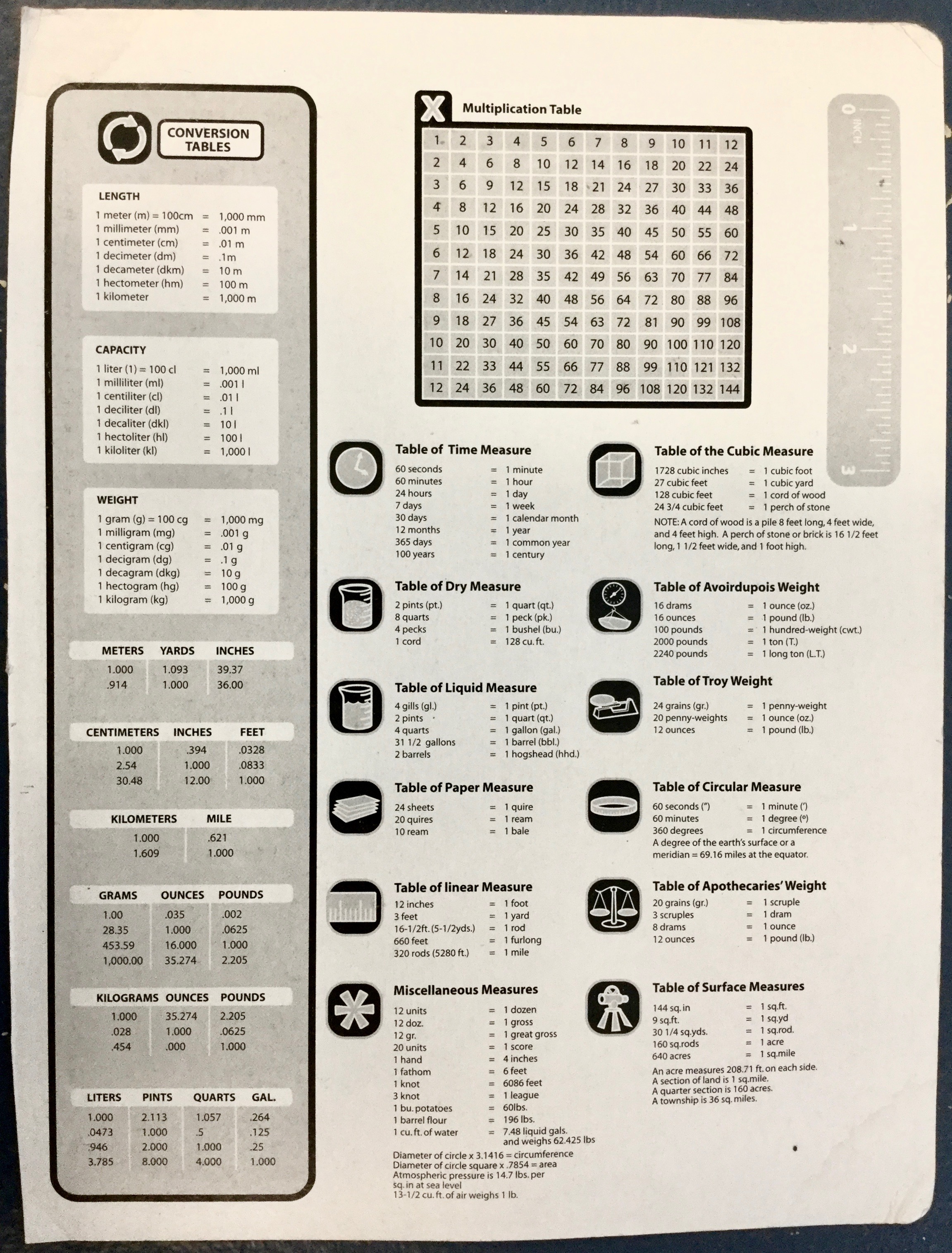 This Useful Information chart is on the inside back cover of a graph paper composition notebook. The cover is not the typical marble design. Right away I see some cool icons and graphics…the other Useful Information charts 1-3 have only text. Also, this one has a 3-inch ruler! The content is much the same as chart 2.