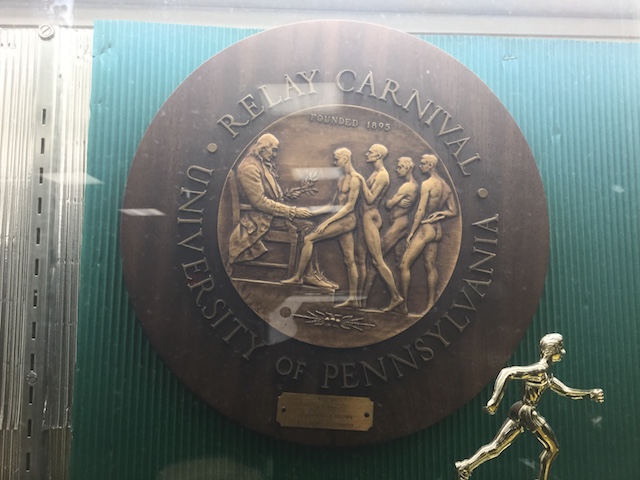 It is common to find that certain enormous high schools have been subdivided into several smaller ones, all housed within the same building. At one such site in the Bronx, I saw these Track and Field awards for a competition that had been held at the University of Pennsylvania. If you zoom in, you can see that these relay runners are completely nekkid, and they seem to be coming up to say hello to Ben Franklin. I know that during the ancient Greek Olympics the athletes were naked, but during the American Revolution too?