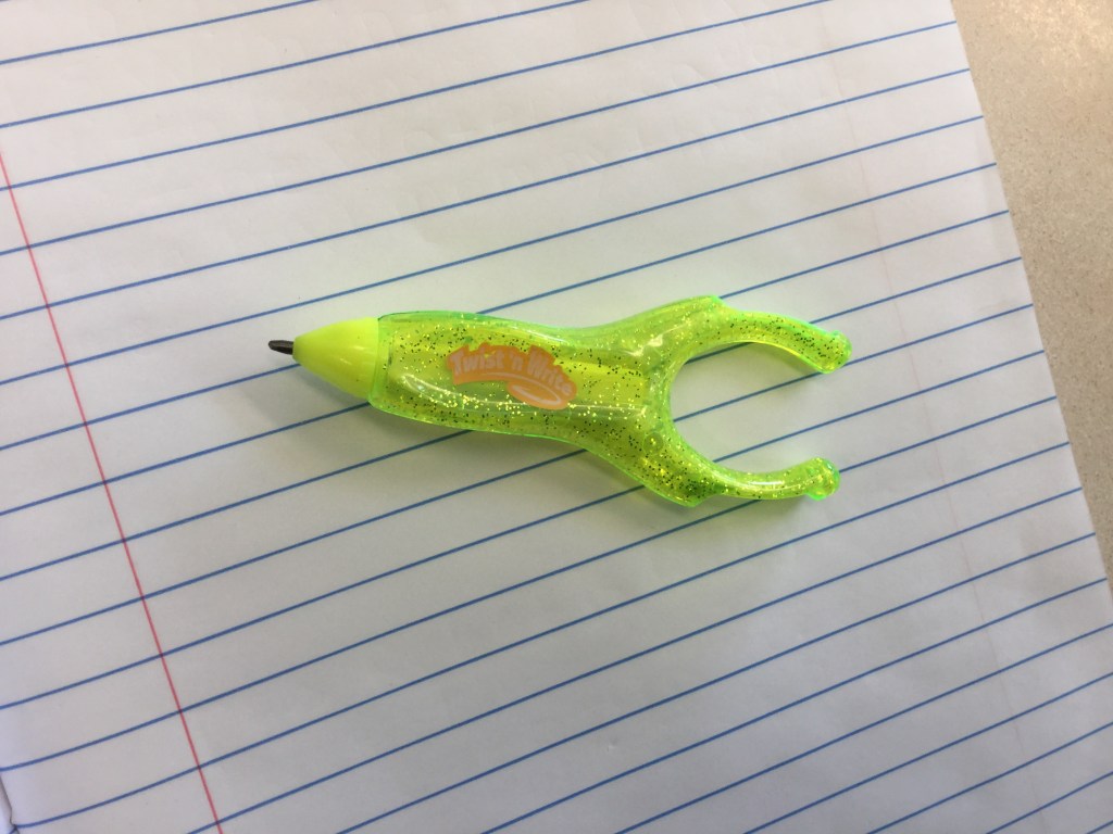 A teacher had this pencil for a student with limited manual dexterity and/or cannot grasp a stylus. This pencil snaps onto a finger. Twist the top to advance the graphite.