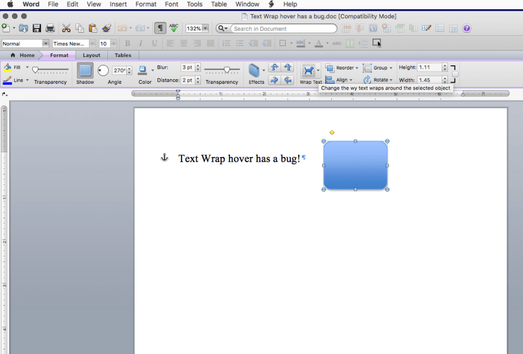 This bug appears in MS Word for Mac 2011 documents, when saving files in compatibillity mode (i.e., .doc file types, not .docx).