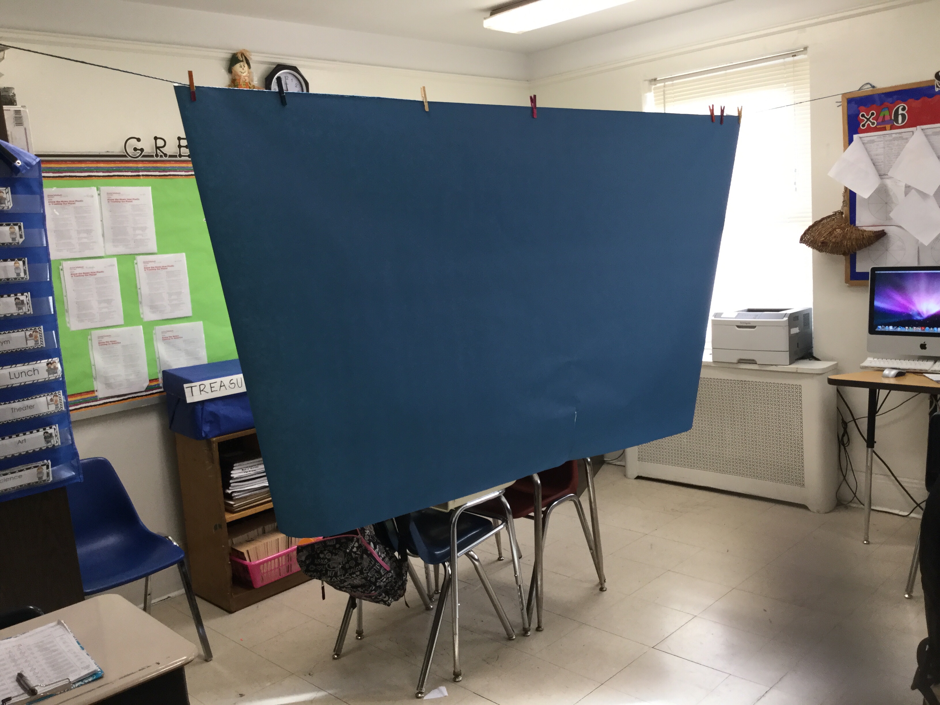 Who says you must use a green screen to make movie magic? This teacher used blue bulletin board paper hung from a wire across the room.