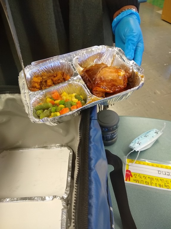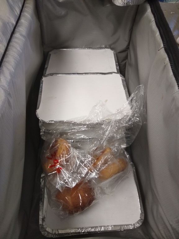 This is barbecued chcken thighs, plus vegetables, roll, etc.