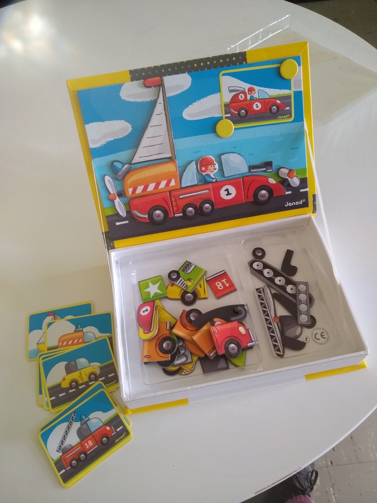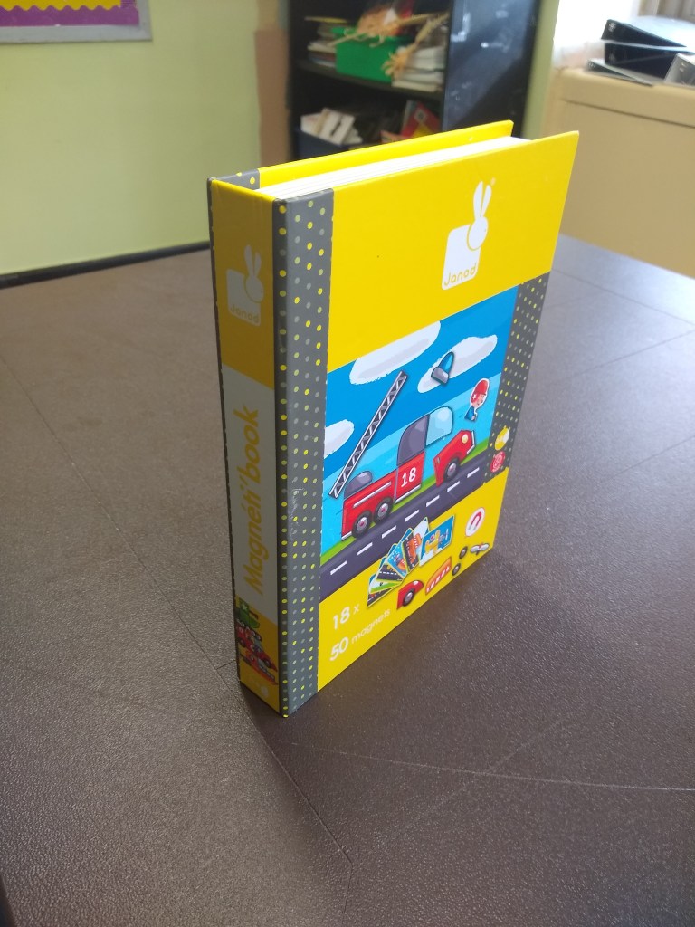 Was this around when we were kids? I have never seen this before. The closest we had was Colorforms, which was too abstract and that vinyl plastic could never be put back correctly. I probably have the last copy of this toy in America: Janod is currently only delivering their toys to France and Belgium.