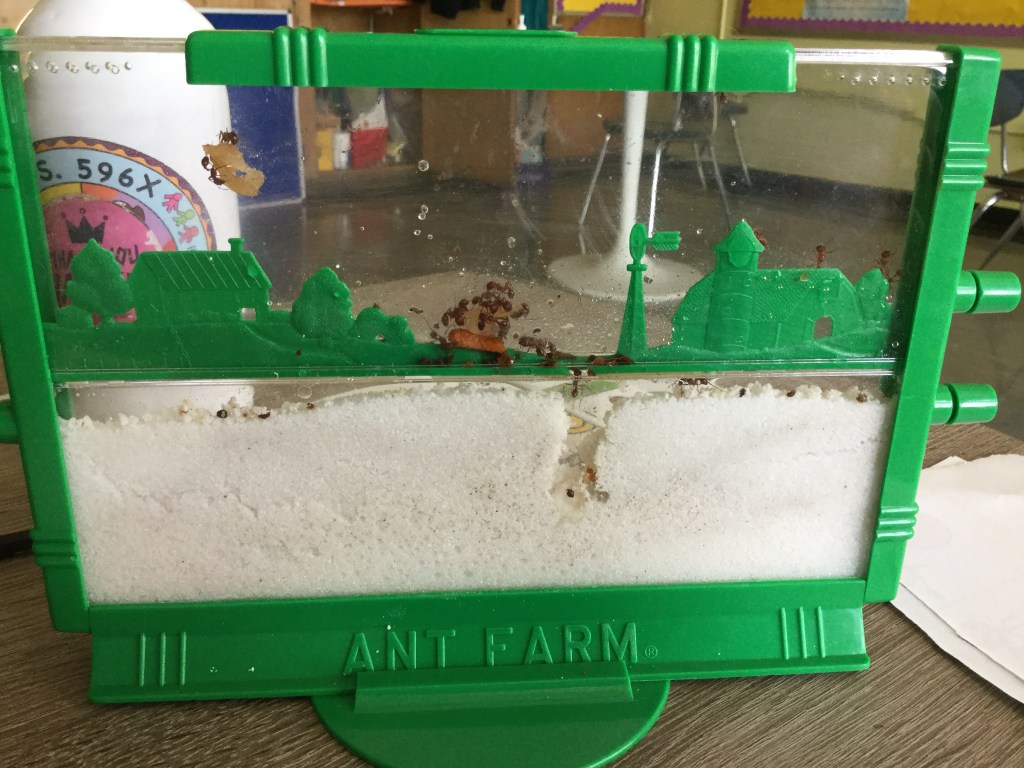 One Busy Ant is taking the lead in clearing out the tunnel. The other ants are chowing down on a piece of pear. And it was evening and it was morning, day 1.