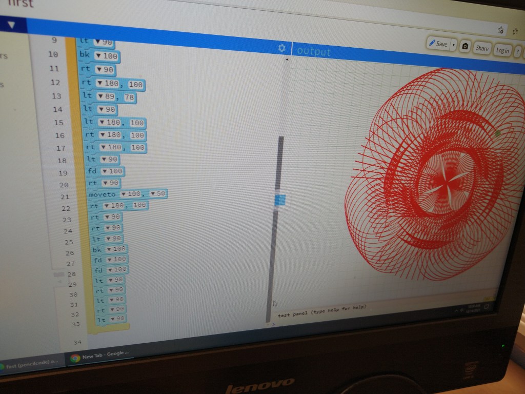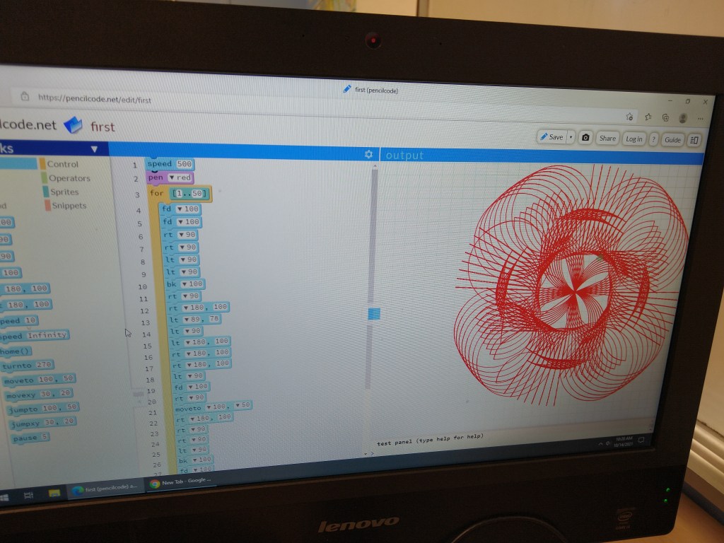 A student tinkered with an existing pencilcode.net algorithm and made this cool spiral design. He made me take two photos of his screen, so I could get the last few lines of code at the bottom!