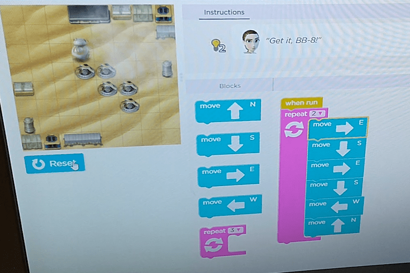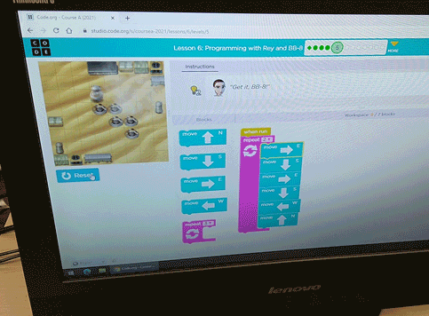 Here is an example of an on-screen robot being commanded by an algorithm. There is a “repeat” block in use. Do you think the code is beautiful? (The code.org doesn’t think so)