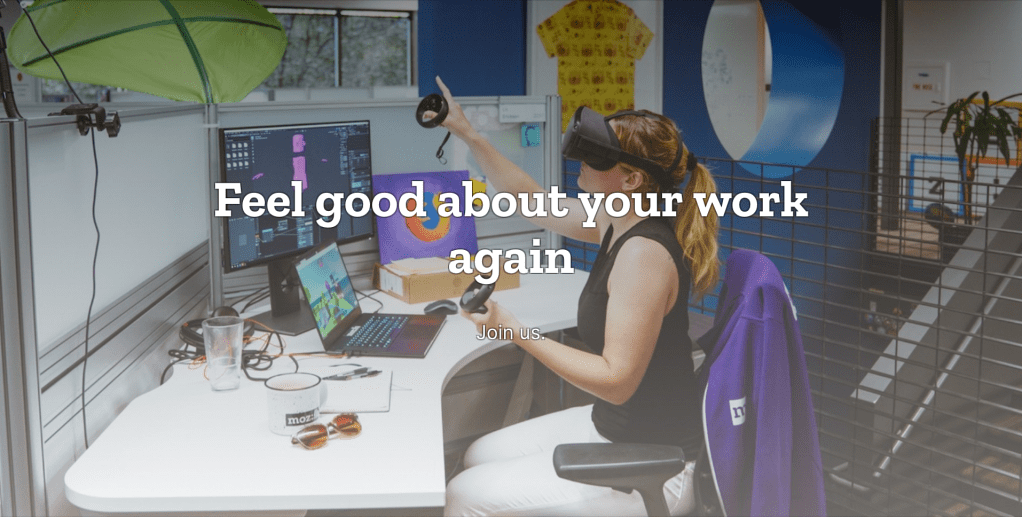 This image from the Mozilla (i.e., Firefox) jobs website: Can the irony be lost on them? She is literally in a cage and needs vr goggles to escape her misery.