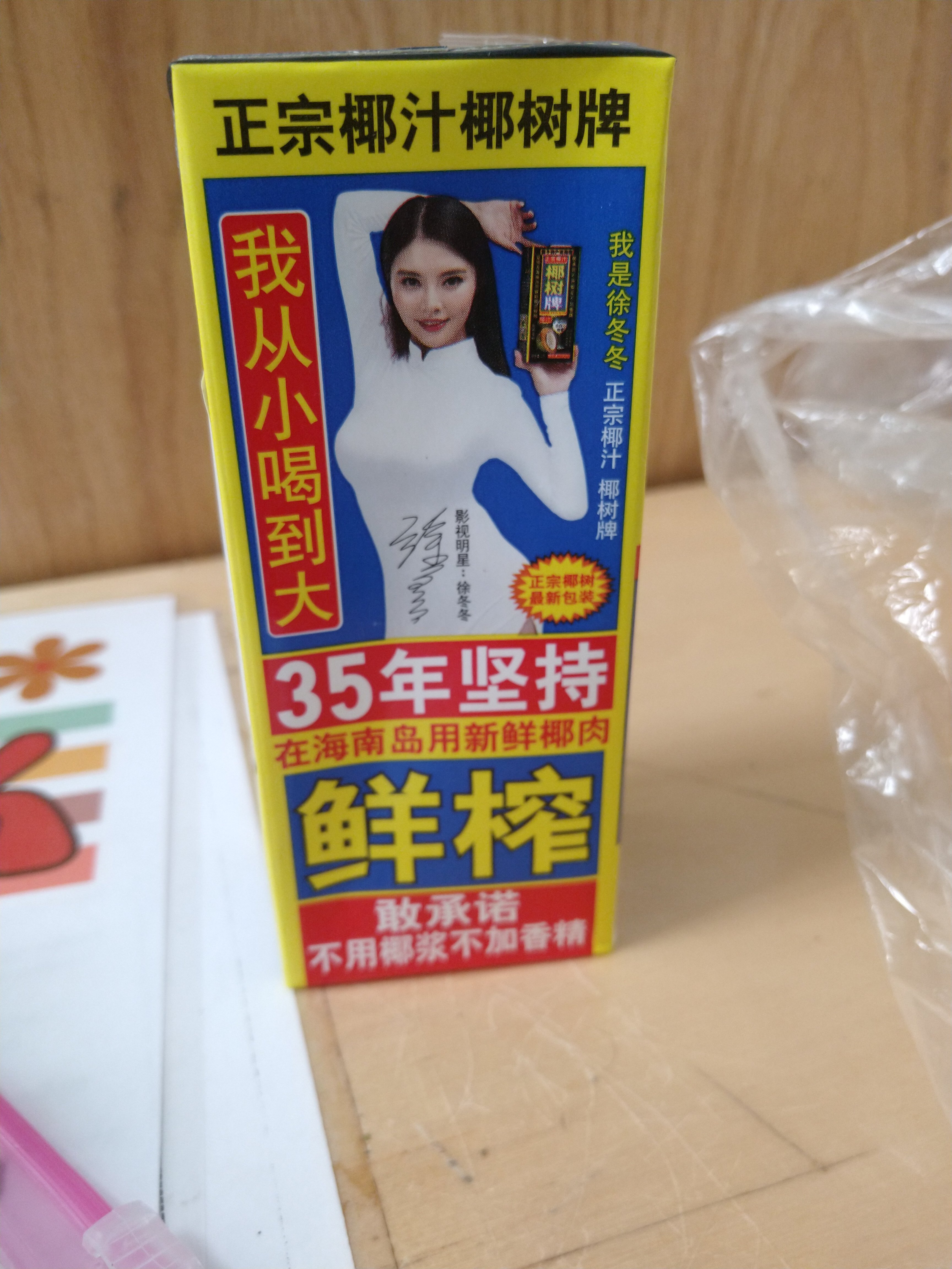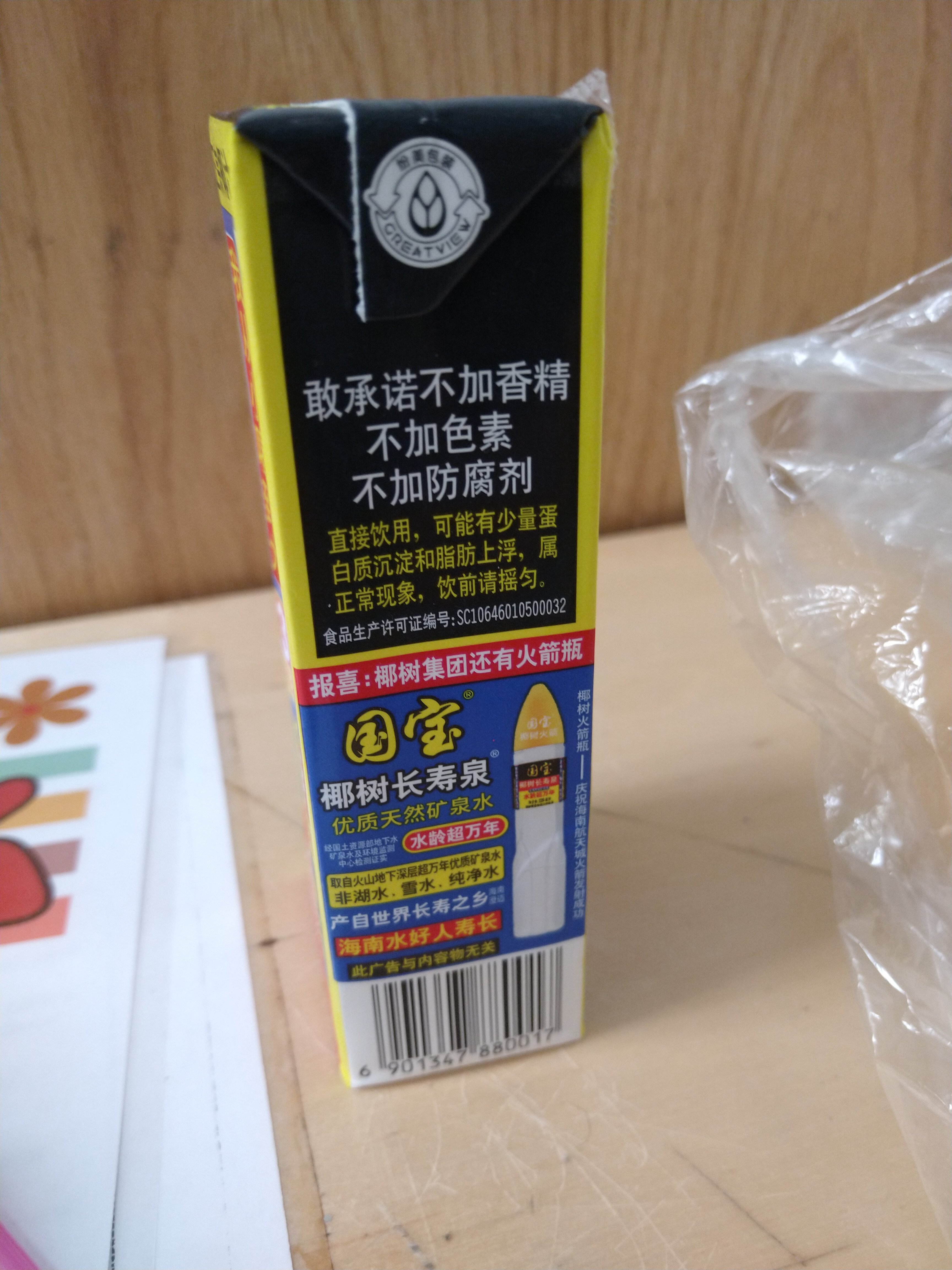 Some kind of packaging on this coconut beverage.