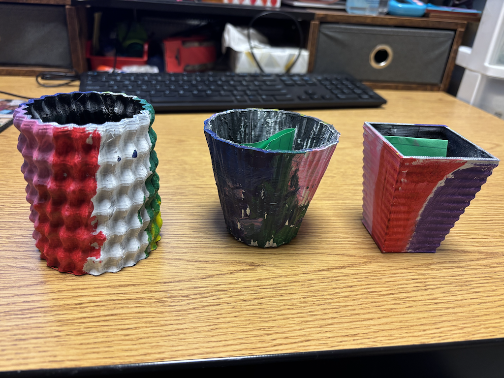 I imported them into TinkerCad to reduce the width of the walls and make a drainage hole. After printing and shipping them to the students, they painted them and then planted little plants inside.