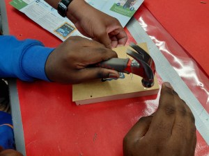 Students in the 12:1:1 alternate assessment class worked in pairs to create Lowes letter boxes. They used hammer and nails, followed multistep directions, worked independently (or with minimal assistance), and customized their final products.