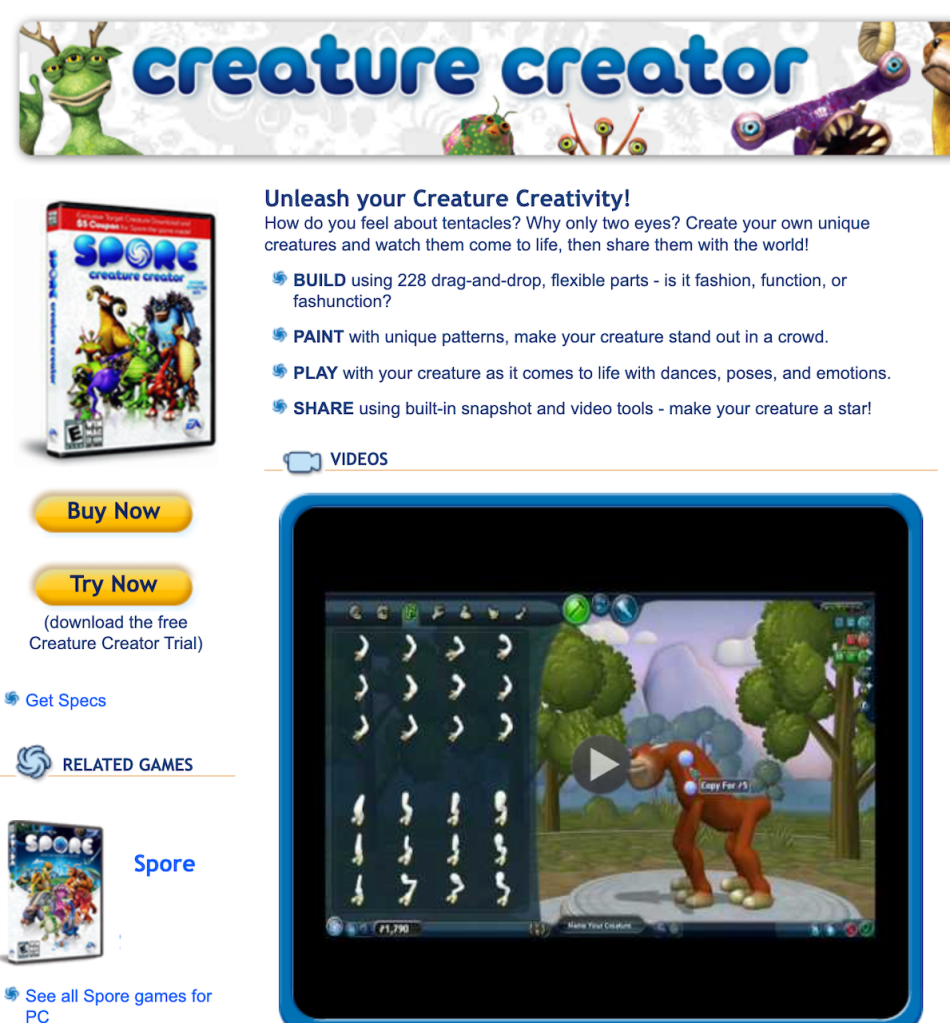 I remember an amazing software program called Spore Creature Creator. Players create monster-animals using an amazing variety of drag and drop arms, wings, spines, mandibles, tentacles, etc. The graphics were in 3D and there was motion and sounds. Truly superb. I think it is still around, though it is not web-based.