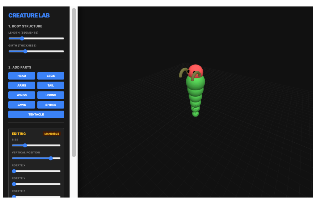 - I want you to create an interactive standalone that works like SPore creature creator, except limit it to head, body, legs, arms, tails, wings, horns, mandibles, spikes, tentacles, make them customizable, and make the final project exportable to an stl file