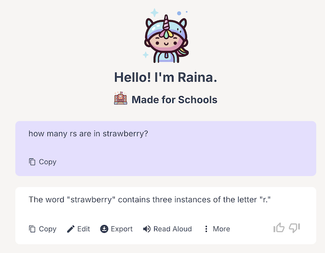 Raina, the AI chatbot by MagicSchool, did correctly count the number of Rs in the word “strawberry.”