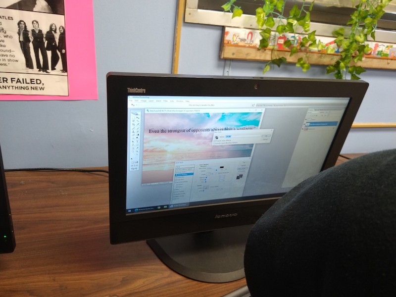 Some students are learning graphic design with an older, legacy version of Adobe Photoshop. In this photo, a student practices adding text to an image. He explored the different layer styles too.