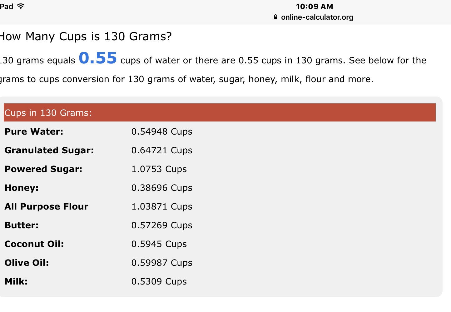 So which is correct? It is not so simple. According to this online-calculator.org, 130 grams equals .55 cups of water, which is very close to the 1/2 cup mark, but only .38 cups of honey and over a cup of flour.