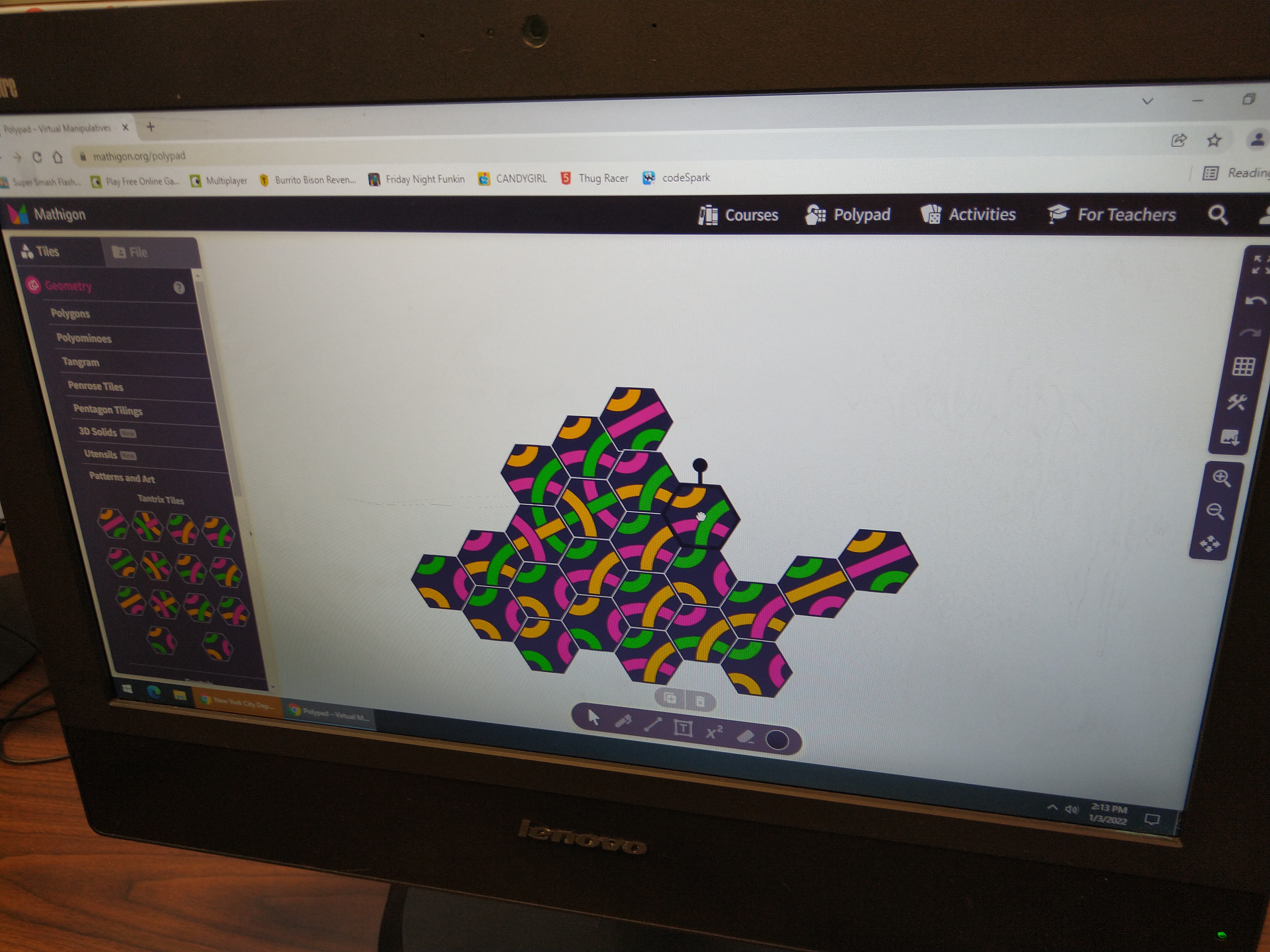 My last period “guinea pig” class tested out a couple of “math as art” programs, using the polypad section on the mathigon.com website.