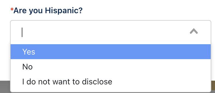 Also interesting: For Hispanic and Race, the last options is the innocuous statement “I do not want to disclose.”