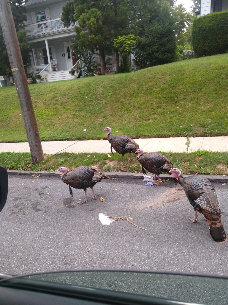 On the drive to a school in a more — remote — section of Staten Island, this flock of wild turkeys was lurking by the side of the road. They were up to no good.