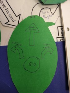 Second time I am seeing the class this week. First time I pretended to be a robot and they programmed me to get to the lightswitch in the doorway…move forward x number of steps, turn left, turn right.