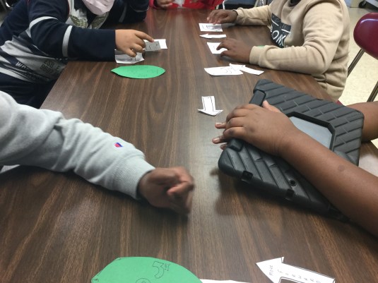 This class of five students familiarized themselves with arrow commands: move forward, turn left, and turn right. They are made of paper, though I really should laminate them.